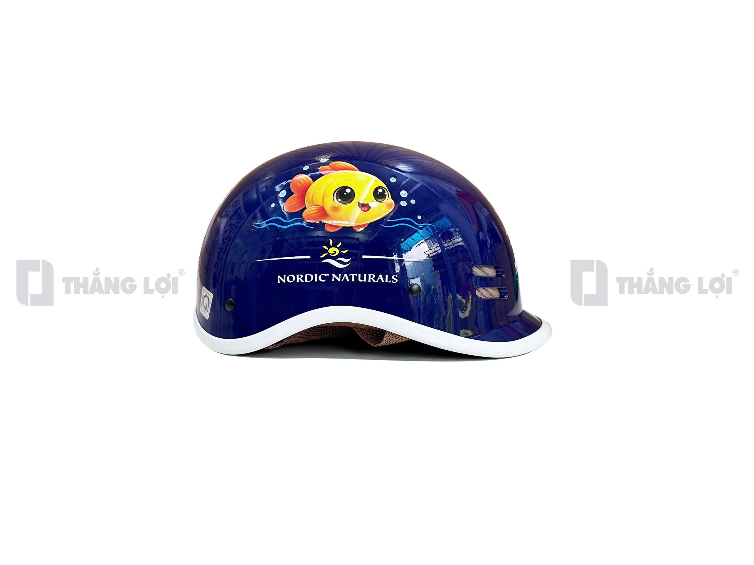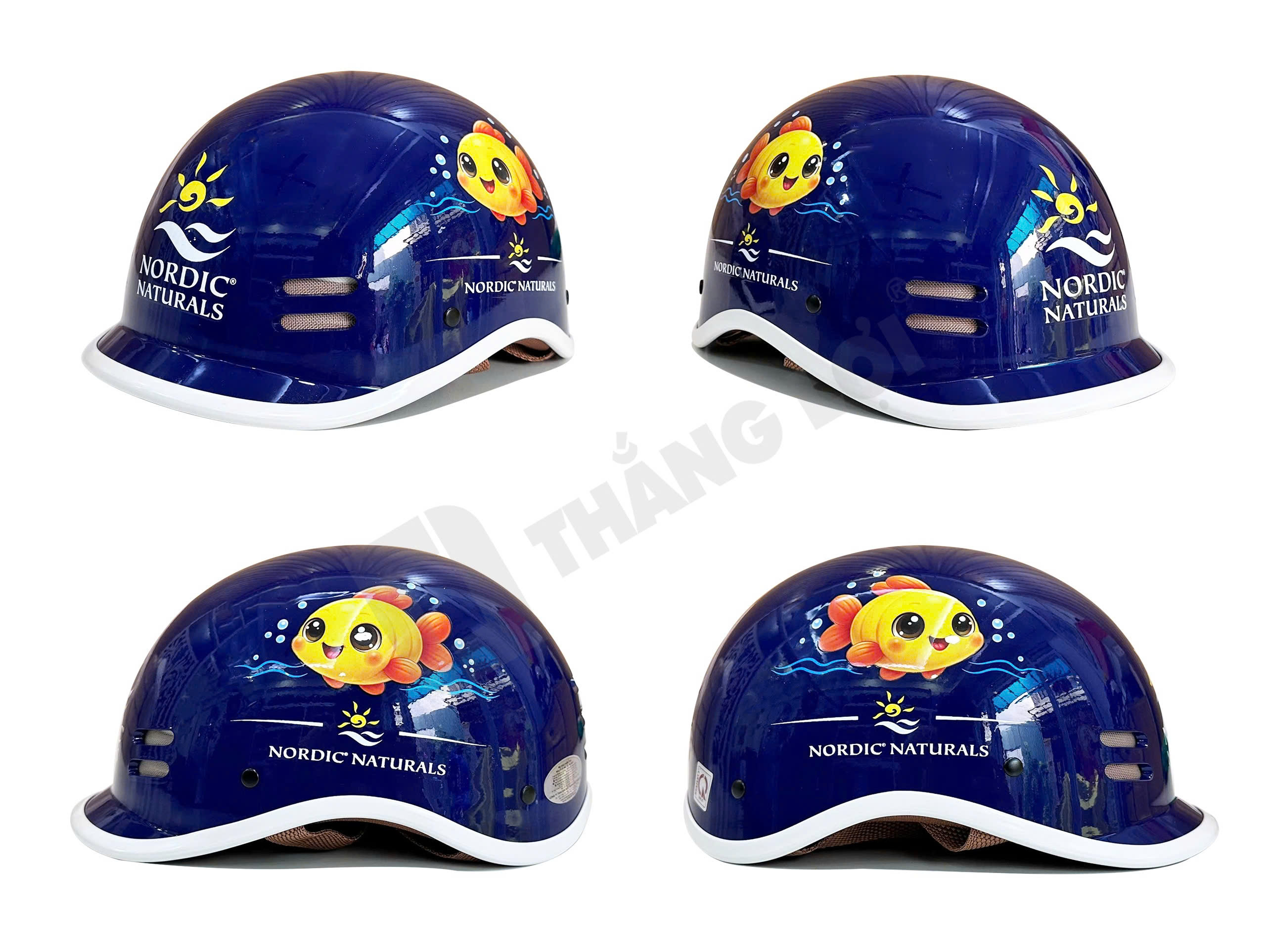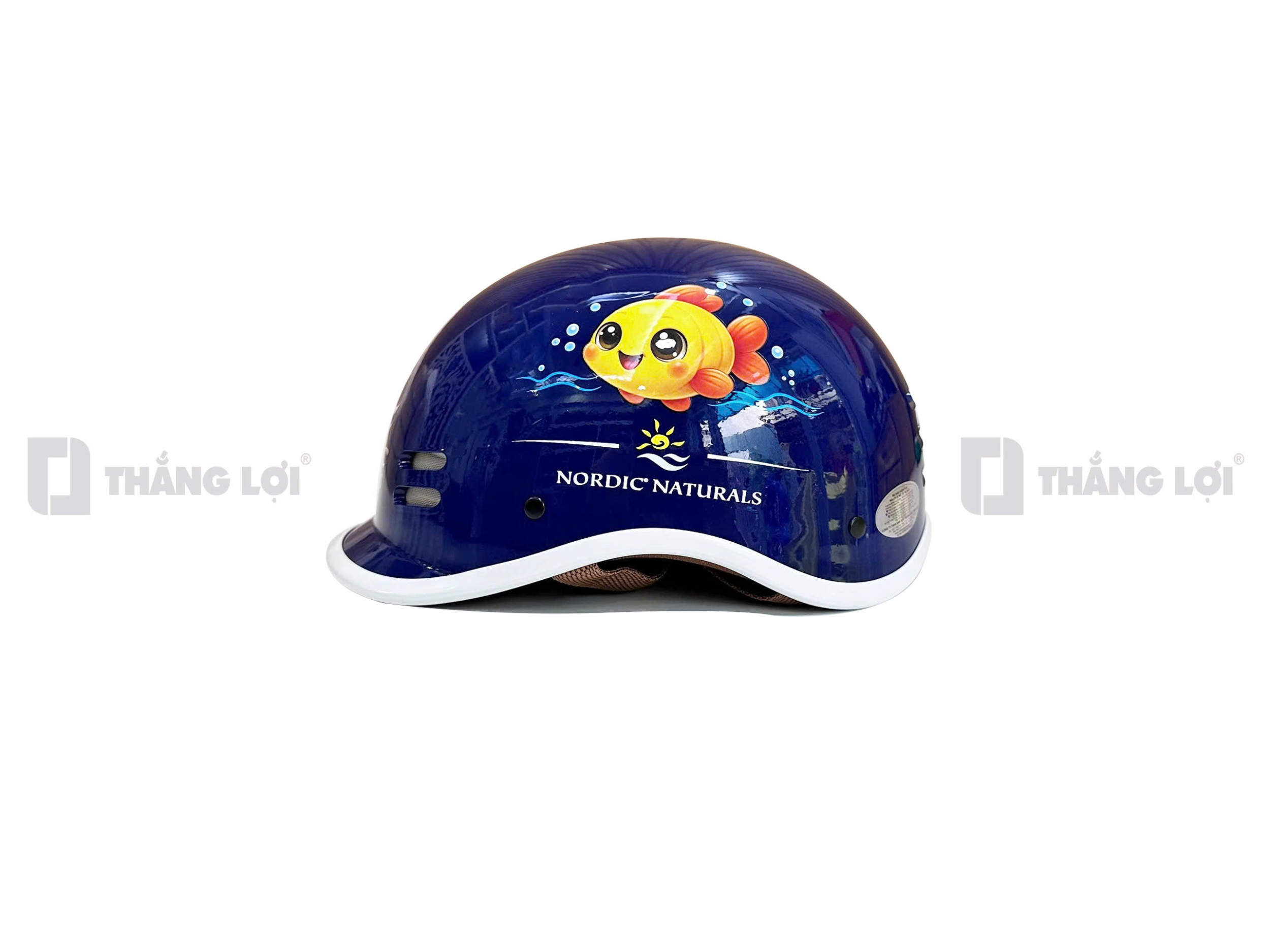 Điểm "ăn tiền" nhất của chiếc mũ nón bảo hiểm in logo này chính là họa tiết chú cá/cá heo màu vàng cam cực kỳ ngộ nghĩnh, bơi lội giữa những bọt nước sinh động. Thiết kế này đánh trúng tâm lý yêu thích sự dễ thương của các gia đình có trẻ nhỏ, tạo thiện cảm tự nhiên nhất với khách hàng. Logo "NORDIC NATURALS" được đặt trang trọng ở hai bên hông và phía sau, kết hợp cùng hai rãnh thông gió không chỉ gia tăng tính thẩm mỹ thể thao mà còn khẳng định sự chỉn chu của nhãn hàng.